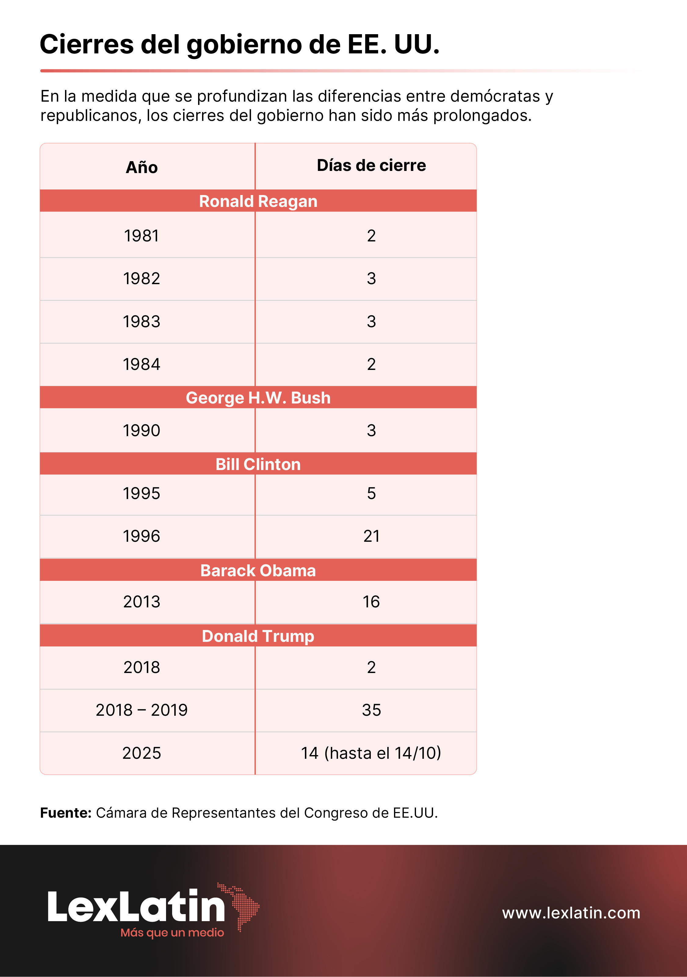 Si bien no se trata de una situación común, el cierre del gobierno no es algo inusual en EE. UU. De hecho, desde 1981, el gobierno de Estados Unidos ha cerrado por los menos 15 veces, algunas de ellas solo por unas horas. El caso más emblemático fue el ocurrido entre diciembre de 2018 y enero de 2019, justo en el primer gobierno de Donald Trump, que se prolongó por 35 días, el más extenso de los últimos 40 años y uno de los tres que enfrentó el republicano durante su primera gestión.
