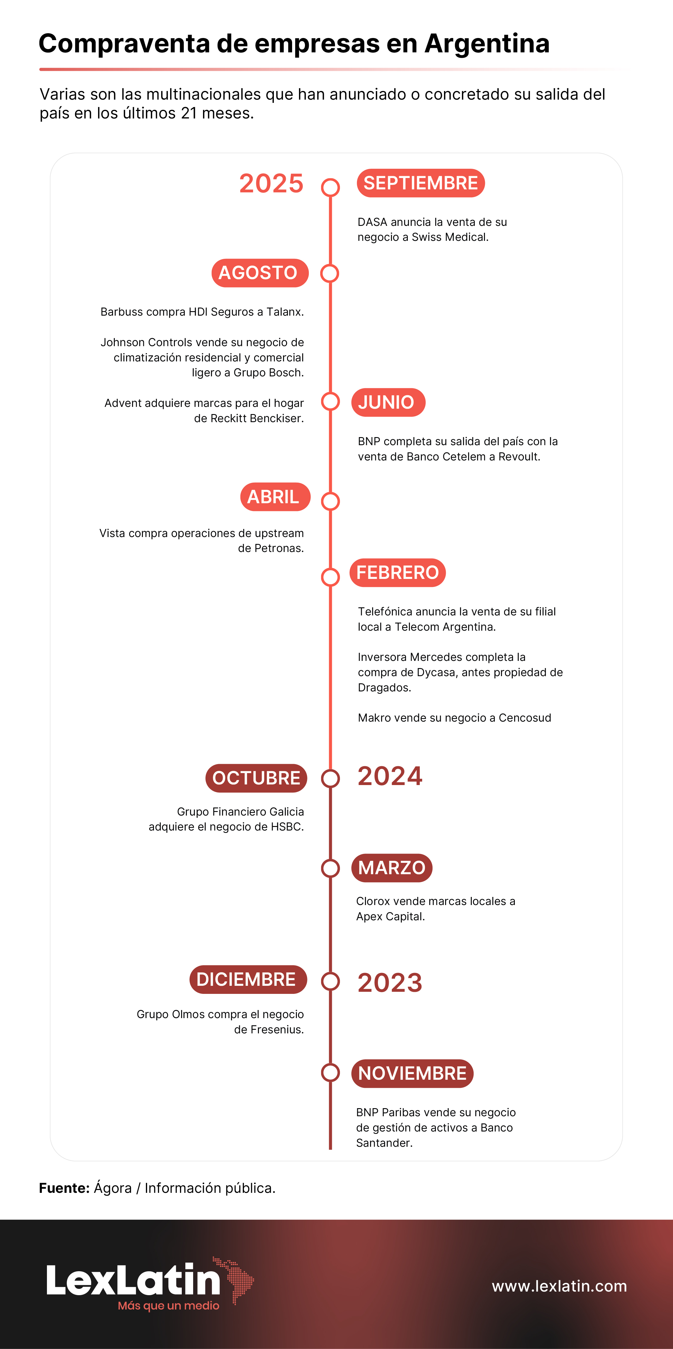 DASA, Talanx, Johnson Controls, BNP Paribas, Petronas, Dragados, Makro, HSBC, Clorox y Fresenius, transacciones registradas por Ágora, herramienta de business intelligence de LexLatin, son parte de lo que ha sido calificado de éxodo, que recrudeció en 2018 con la recesión económica y se fortaleció con la pandemia.